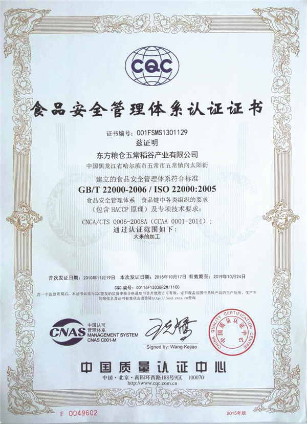 东方粮仓五常园区于2016年通过的ISO22000食品安全管理体系认证证书