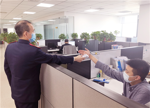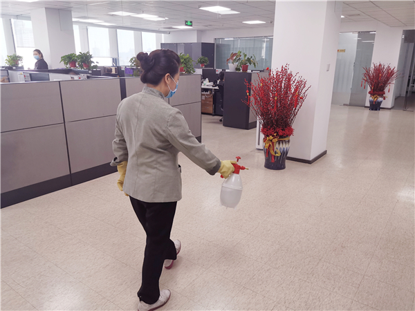 在环境维护方面,公司及时为全体员工购置发放了口罩、酒精、消毒液及消毒湿巾等物品,多时段对办公区域进行全面消毒,同时做好室内的通风,保持办公区域内空气质量良好。